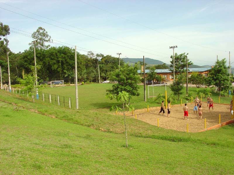 Campo de futebol iluminado e quadra de vôlei de areia.